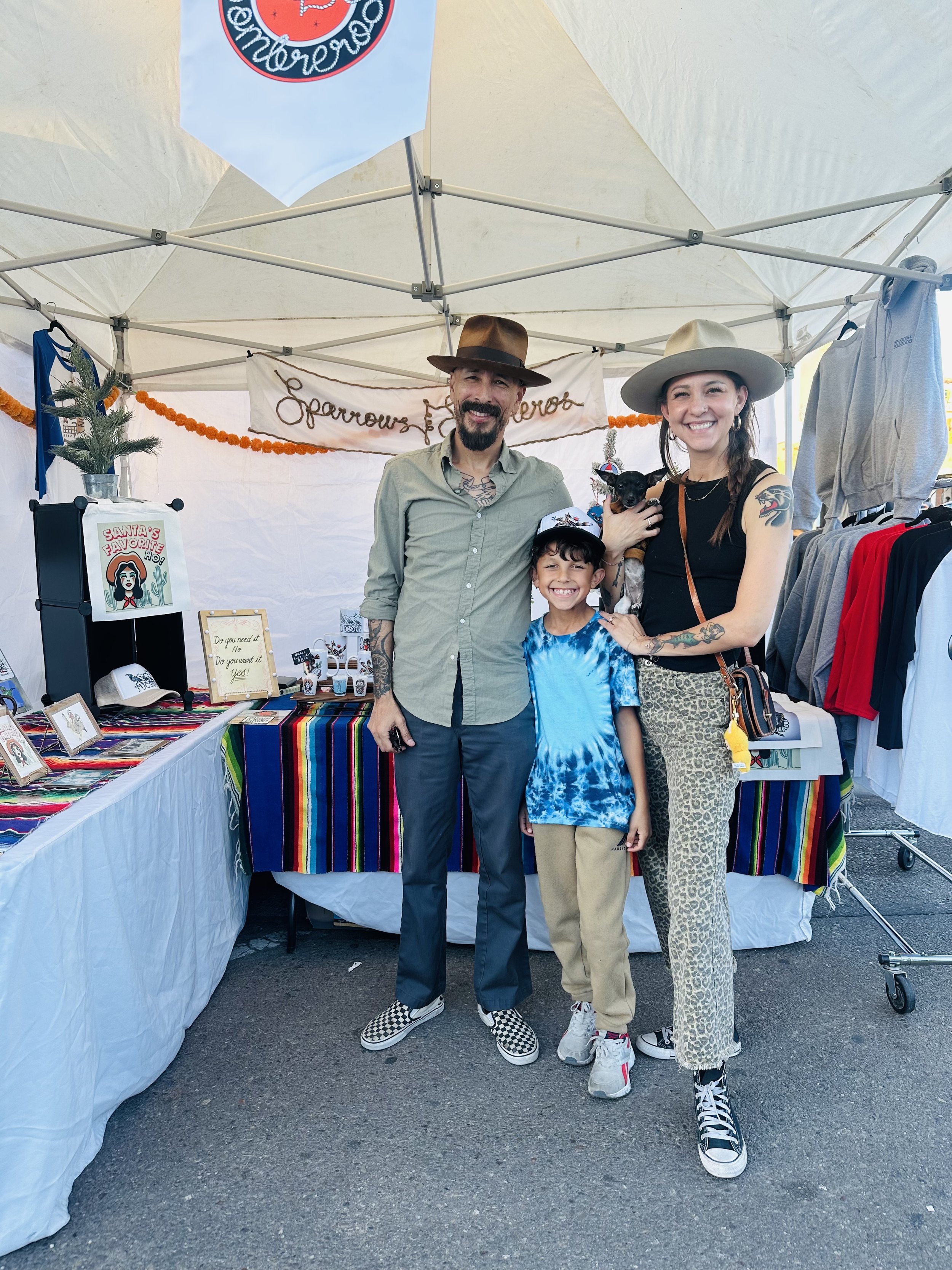 We are set up between Union and Reforma on the sidewalk. You Can miss out on brightly colored tablecloths and fun artwork.
